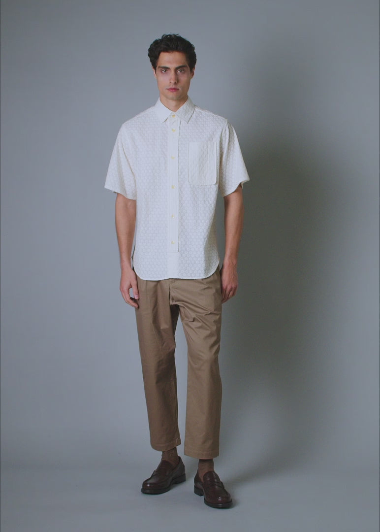 This embroidered shirt is crafted from a beautiful Italian fabric. The custom embroidery is stitched layer by layer, honoring an ancient art form. The result? A shirt in a category of its own. Even the undercollar gets the treatment, lined with an unexpected fabric inspired by the silken interior of bespoke suiting. A discreet button fastener keeps the collar perfectly in place. The floating front placket hovers above the hemline, adding an architectural touch and a masterclass in craftsmanship. This is not just an addition to your wardrobe; it is an addition to your art collection.