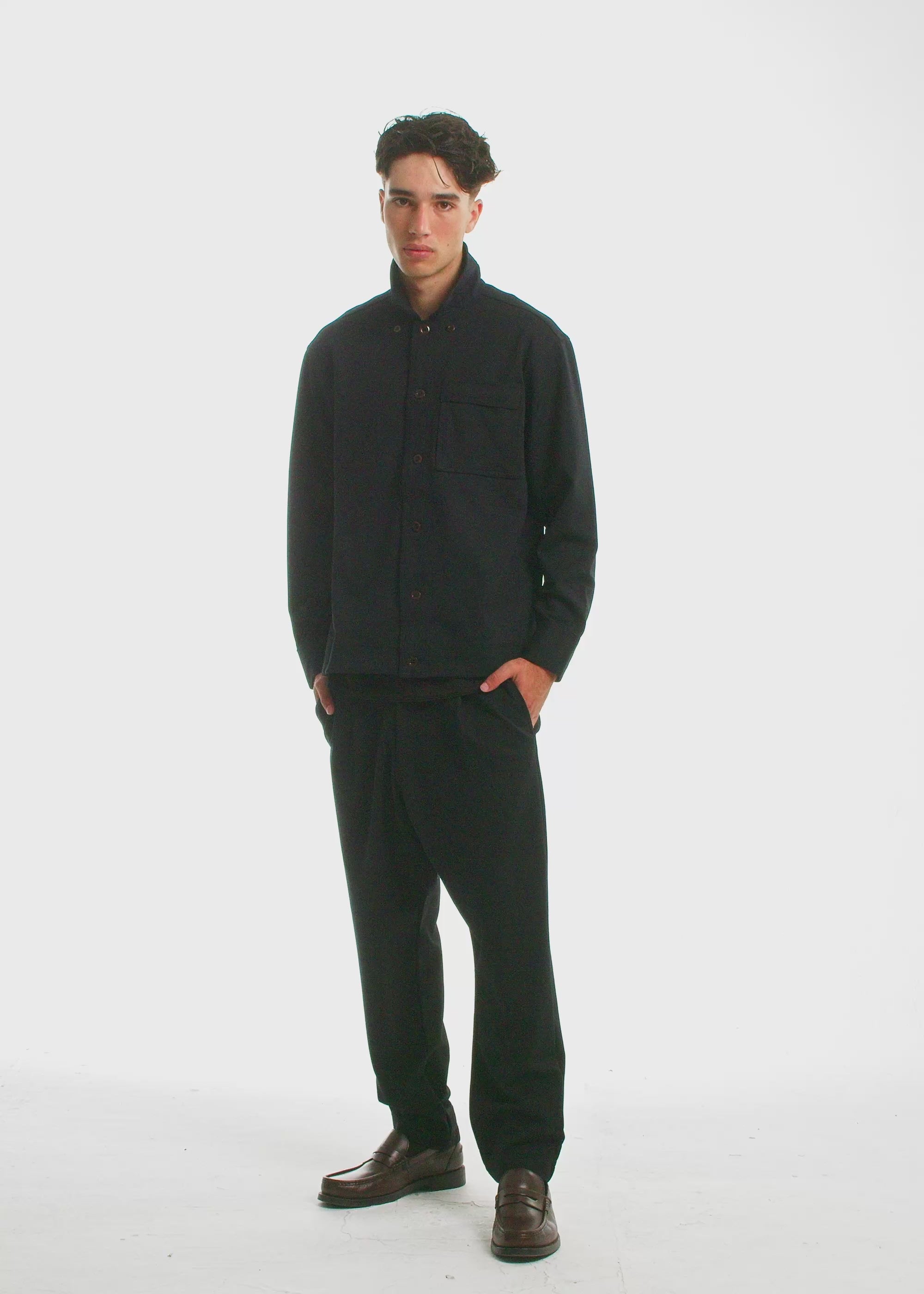 Jet set ready. Travel in absolute style. Cut from a soft, flexible compressed knit that moves in four directions. Wrinkle resistant. Easy to clean. Incredibly comfortable. A clean, structured silhouette. Boxy fit. Reinforced seams. Utility chest pocket. Become a chic modern-day traveler, whether on the plane or off it.