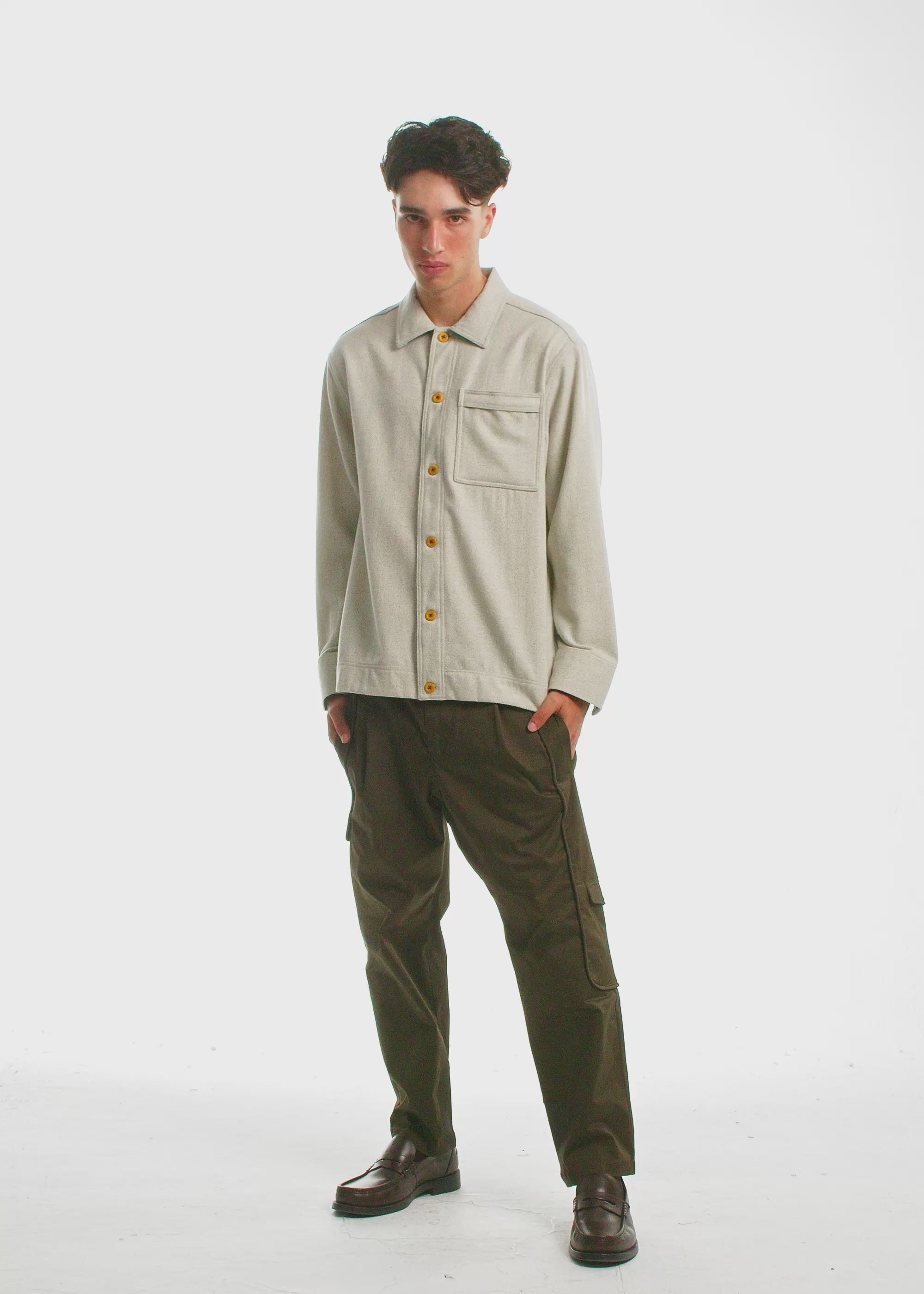 This shirt Jacket features a subtle two-tone micro jaquard woven into the fabric to add texture and depth. Reveals itself only when you’re close enough to notice. Understated on the surface. Layered in detail. The pattern is subtle, almost ghosted into the fabric. Burnt gold buttons break up the simplicity with sharp contrast.