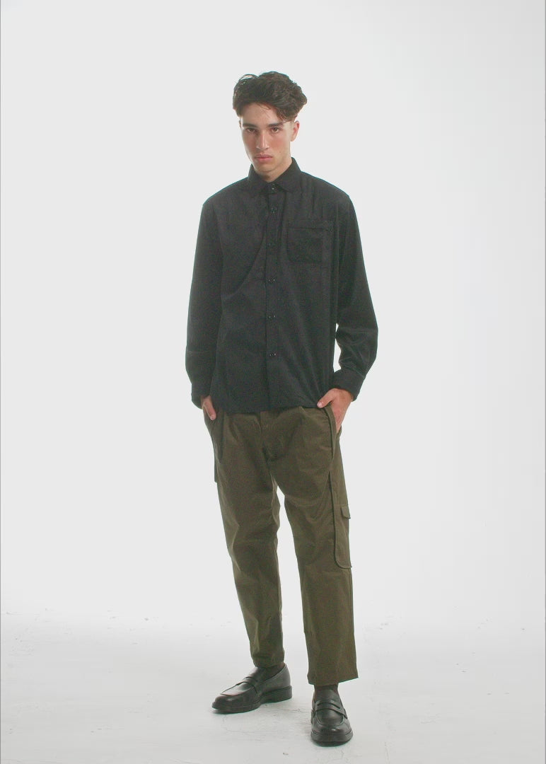 Introducing the Black Ring Spun Shirt. The yarns are tightly twisted, creating natural irregularities and a slubbed, striated texture that gives the fabric depth and character. Rugged. Refined. Deceptively simple. Finished with our signature black metal buttons, cast in Spain with a pinpoint design that nods to 19th-century military precision. The elongated chest pocket? A quiet salute to utility. Nothing here is accidental. Only 130 units made: Love thy Neighbor, but dammit, don't dress like them.