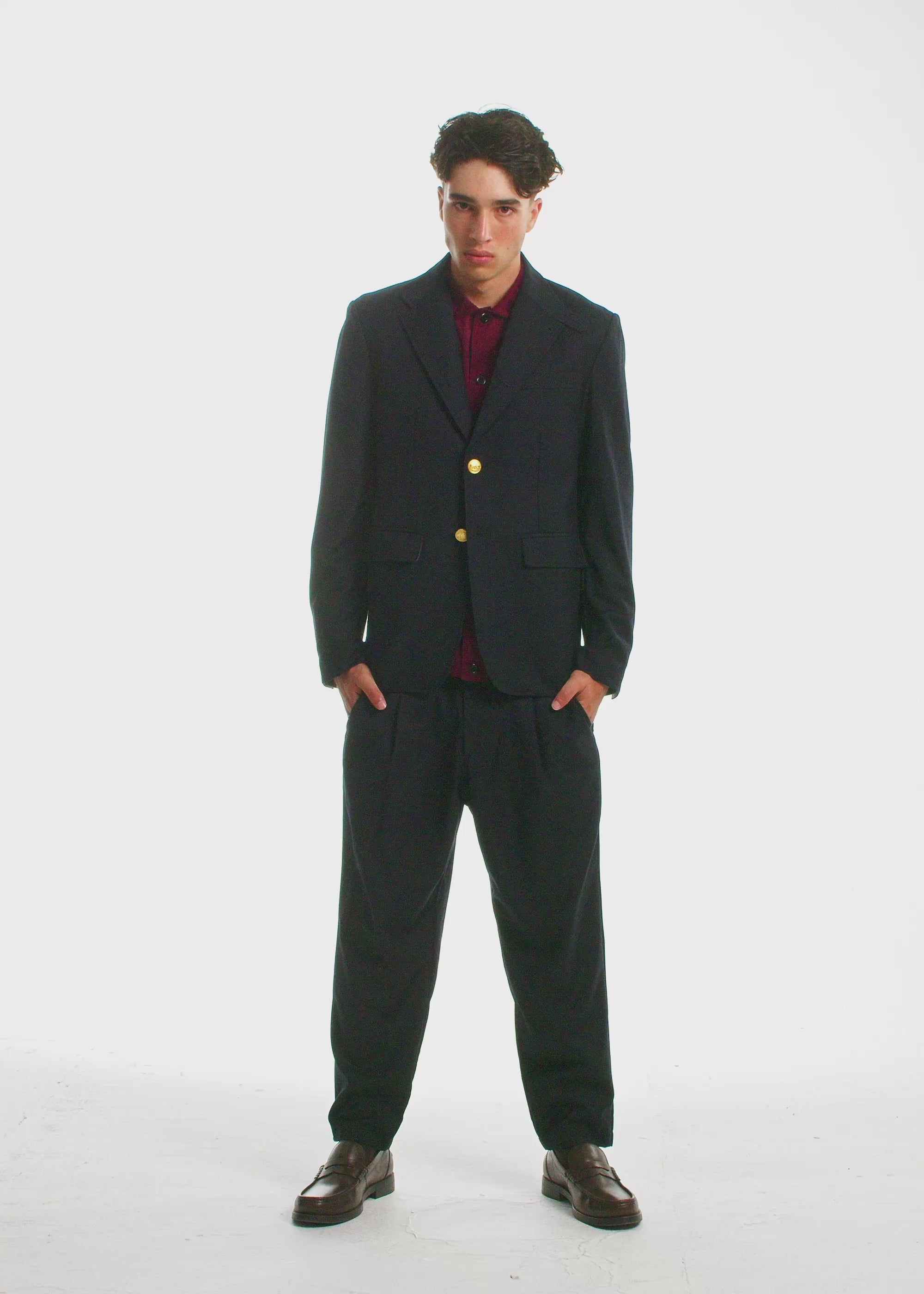 This year-round tropical wool-blend blazer is crafted with sophistication. Its design is inspired by the classic prep school blazer, featuring gold buttons. However, we added a modern touch, including interior striped straps for carrying. The intention behind this jacket is to wear it paired with matching pants or with more casual attire.