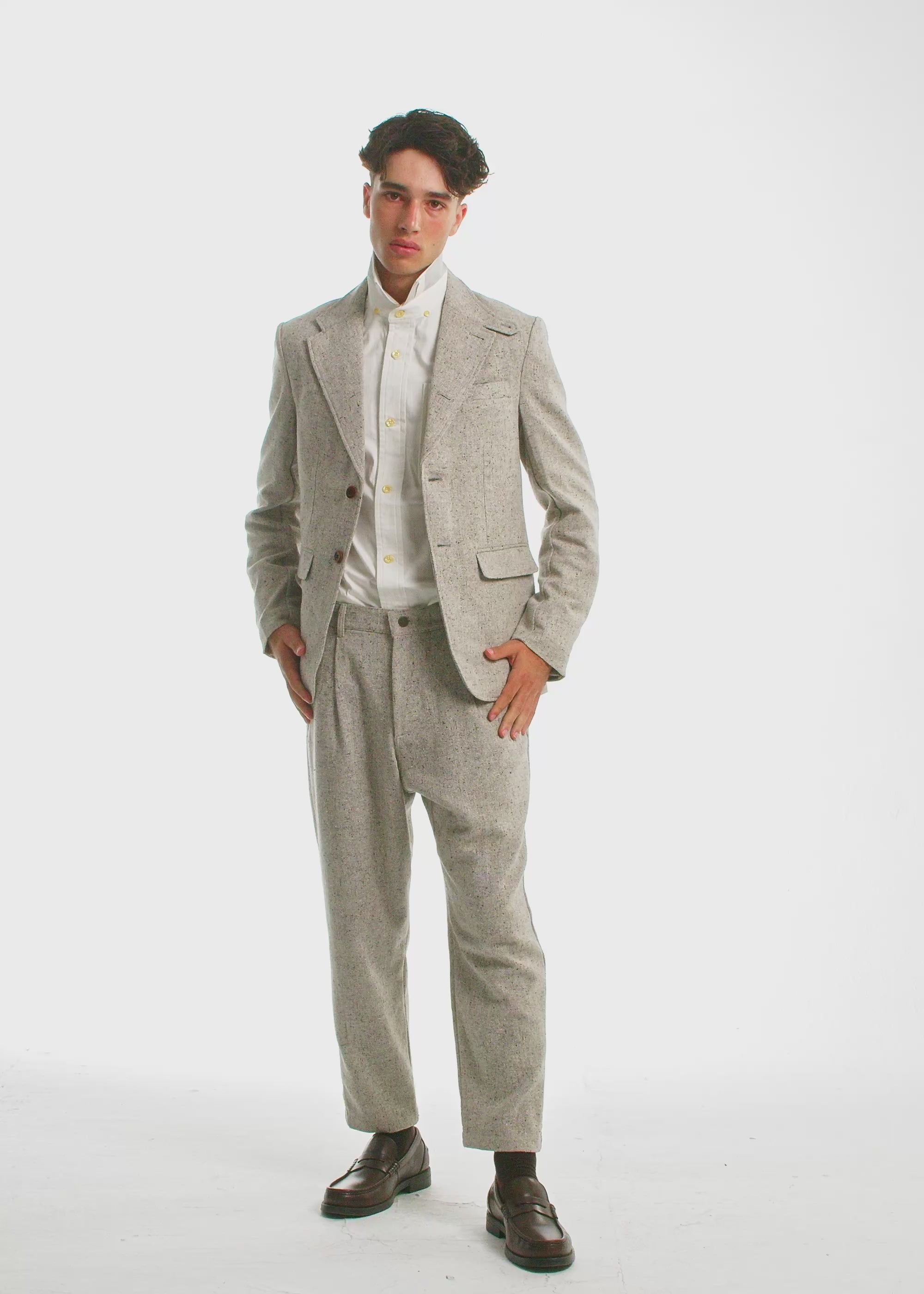 This stone Spec blazer is cut from a wool-blend tweed with a rugged yet refined hand. The surface tells its own story: flecks of darker yarns scattered across a muted grey base. A play on winter white. A quiet contrast to plain solids. Classic notch lapels. Functional button cuffs: A mark of tailored craftsmanship.
