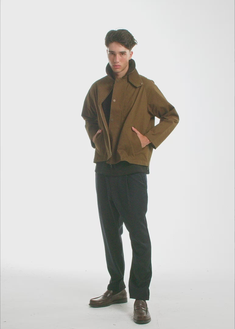 This Driving Jacket is built for movement. Walnut-colored twill, strong and steady. Cropped so it won’t bunch behind the wheel. The high collar fastens clean, folds down when not in use. Raglan sleeves add ease. Welt pockets hold form. A clean front at first glance, but it hides a zip pocket built into the placket. Keep essentials closed and out of sight. Rounded collar in contrast fabric. Sharp hem. A shape first made for drivers. Now cut for the few. Only 130 units made. Love thy neighbor, but don’t dress like them… or drive like them.