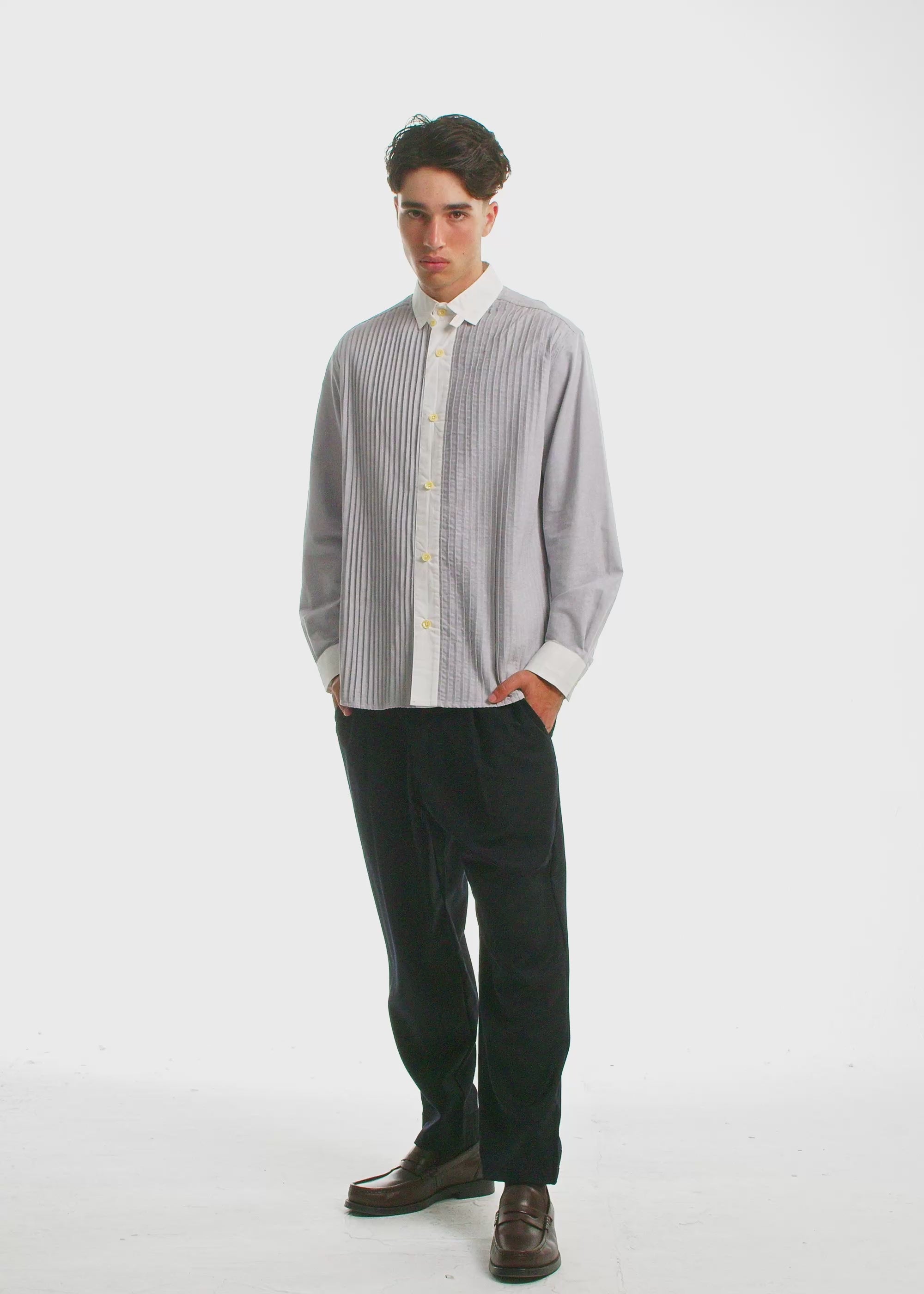 The pin-tuck shirt was once a mark of precision tailoring: rows of narrow folds stitched by hand to create depth. Each tuck is sewn line by line by our tailors. We took a tradition and relaxed it. Cut from classic Oxford cloth, made to be worn casually. The old-school tab collar turns up the edge. Made by hand in small batches for those who move differently.