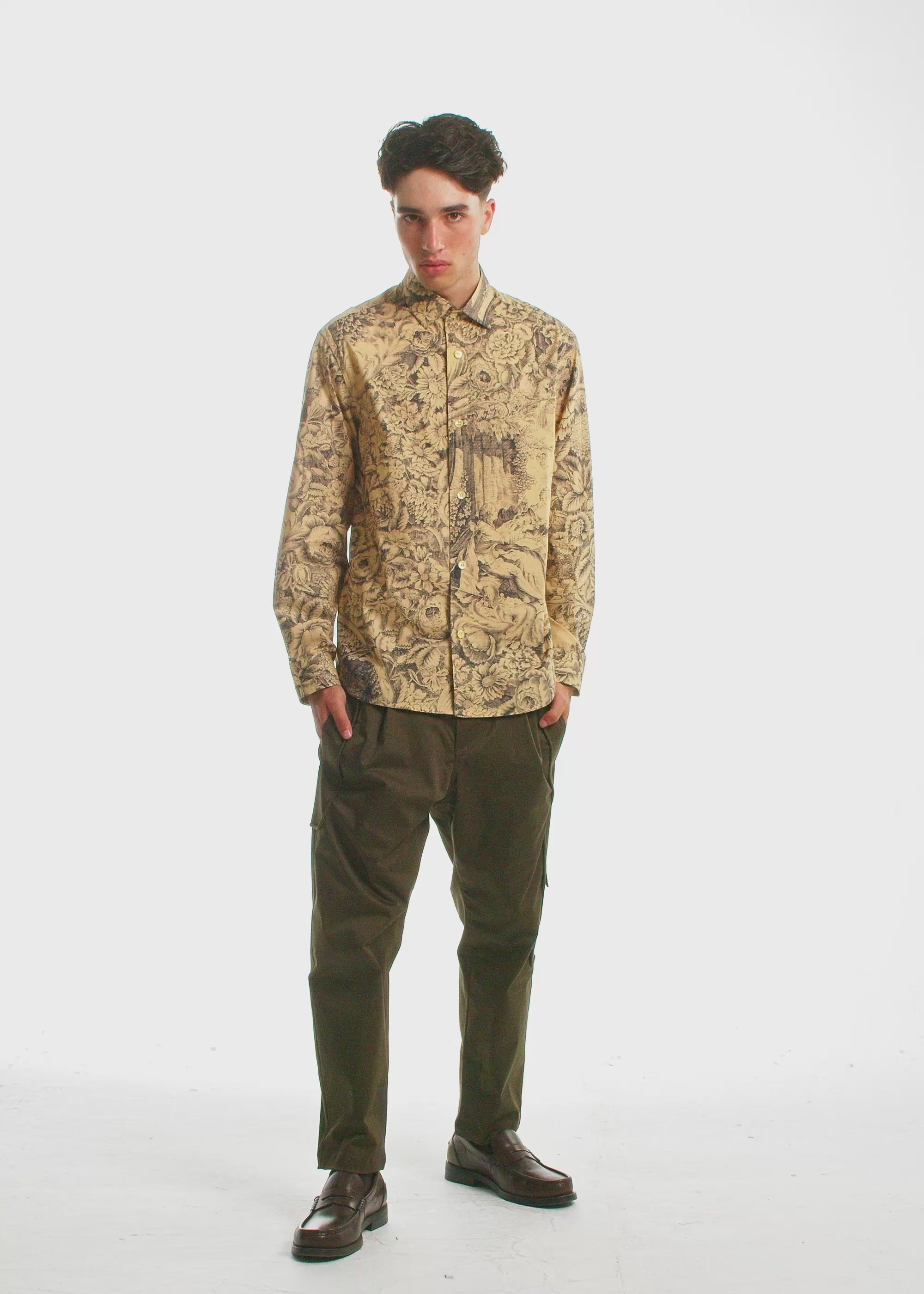 This is our Renai Sketch shirt. Printed like an old tapestry: florals, figures, and forgotten stories. Cream and ink tones. It’s not loud, but it says plenty. The artwork falls into our Darkness Falls series, an installment in our ongoing Mysterious Prints collection, worn by those who never show all their cards. You can buy artwork, or you can wear it.