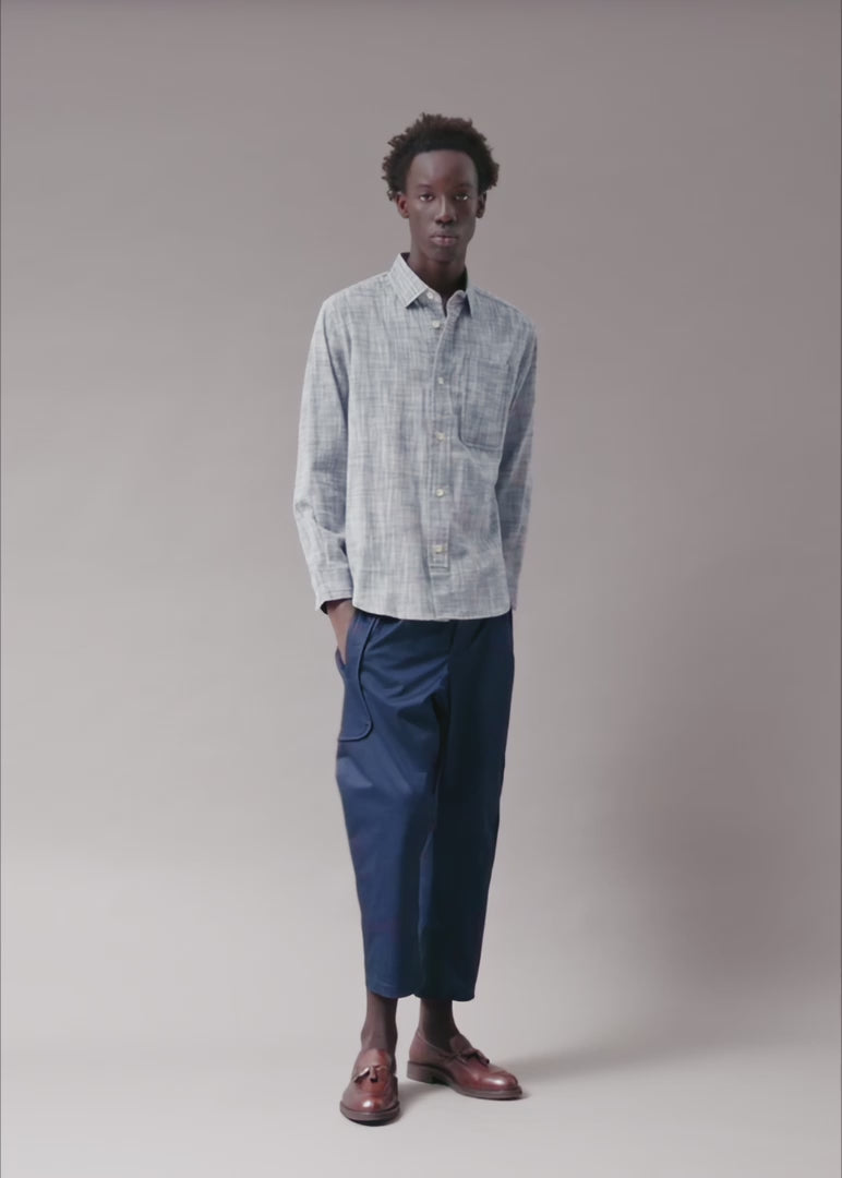 Quiet texture. Strong presence. This cross hatch fabric is a great alternative to a flat solid shirt, adding depth through weave, not print. Subtle from a distance, intentional up close. Soft to the touch. The floating front placket stops short of the hem. Intentional. Architectural. Unpredictable. The elongated chest pocket offers a point of difference. Its double layer construction adds subtle dimension, effortlessly setting you apart from the expected. Made unnecessarily well in limited batches.